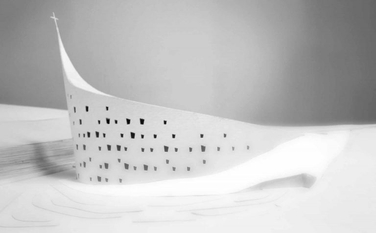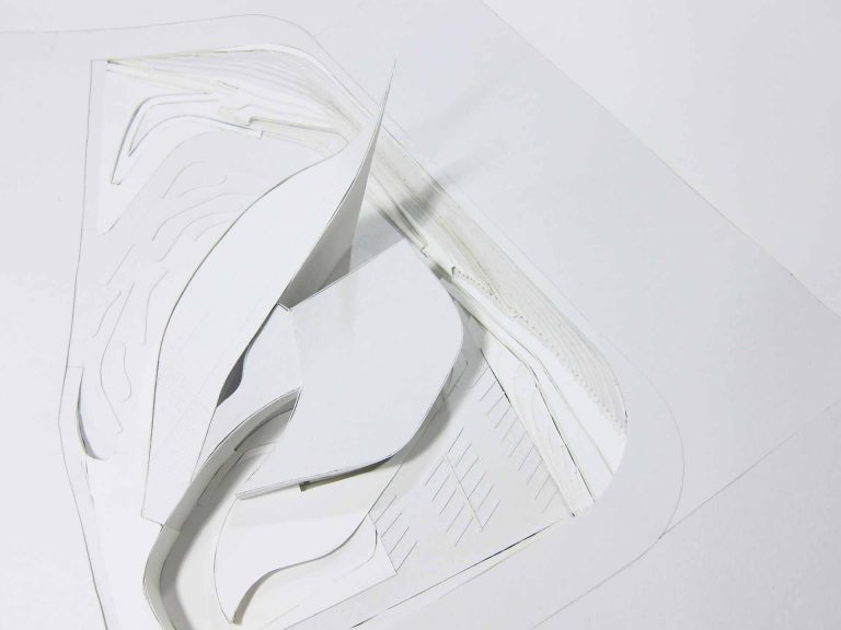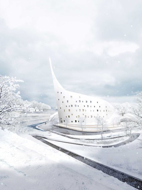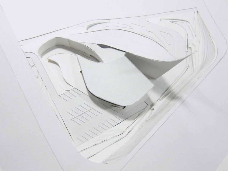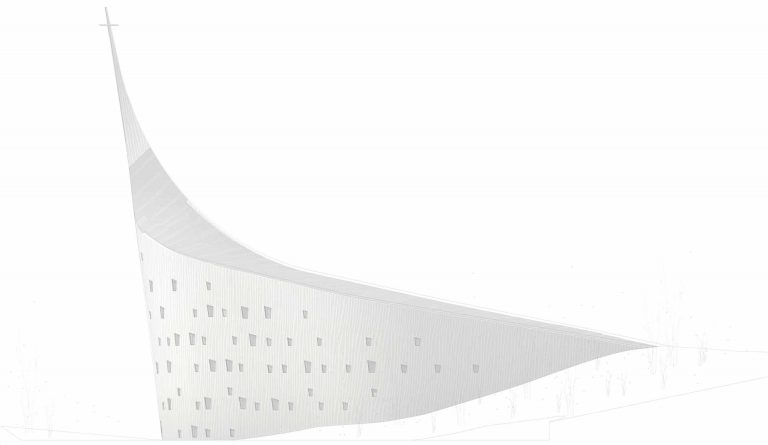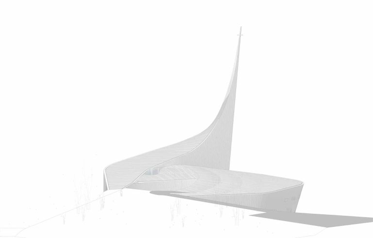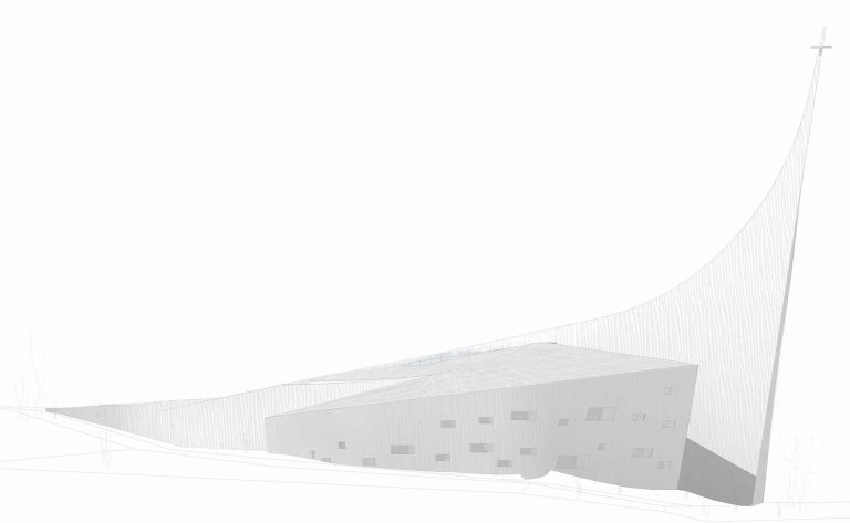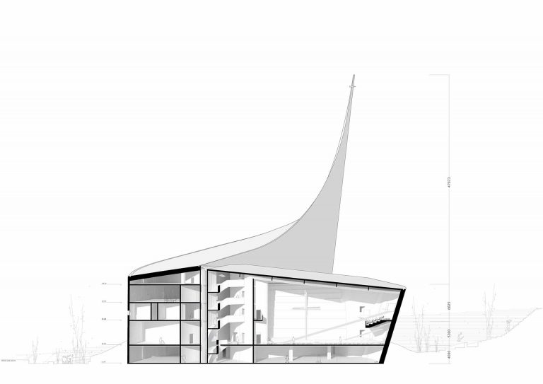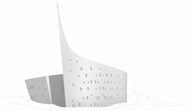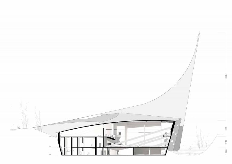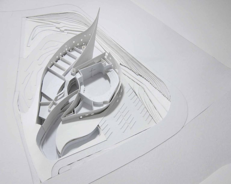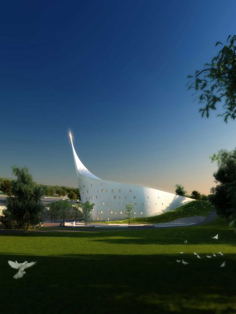 The form of the draft plan is reminiscent of a white dove resting before flying. The peace that passes the silhouette is implicit from the beginning not only because of the floor plan that remembers of a dove but also because the distribution of spaces and the relationship between them, always with curved walls and a topography that embraces both the building and the persons frequenting it.