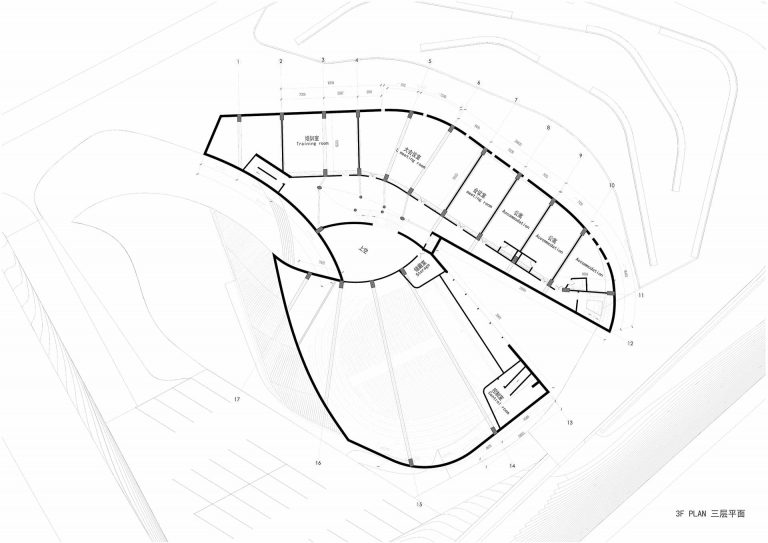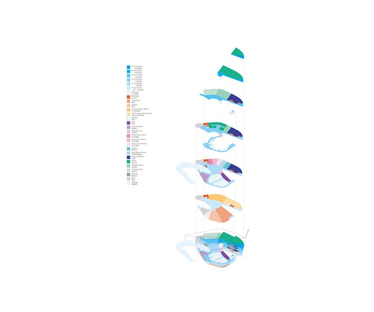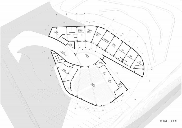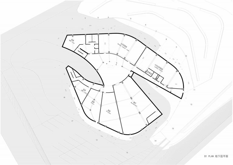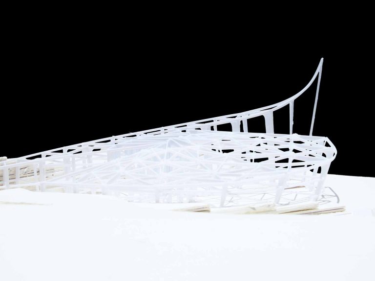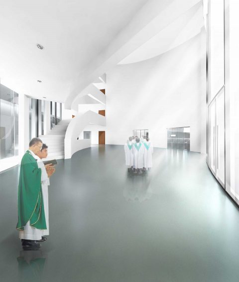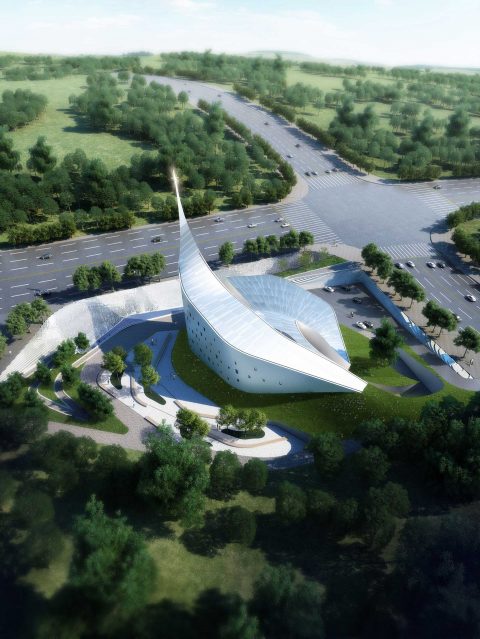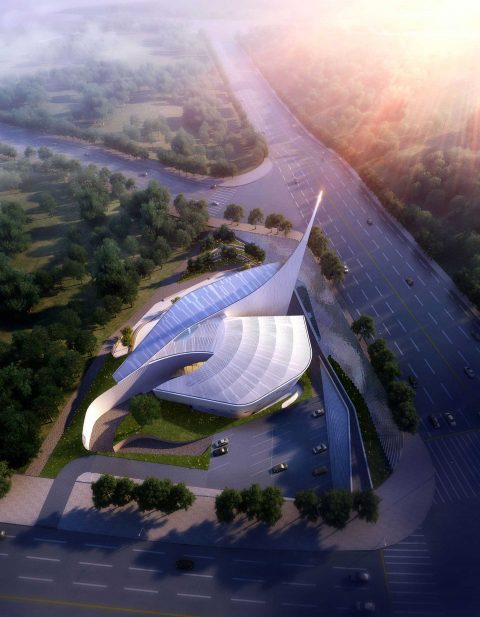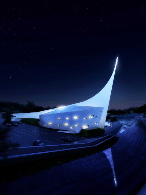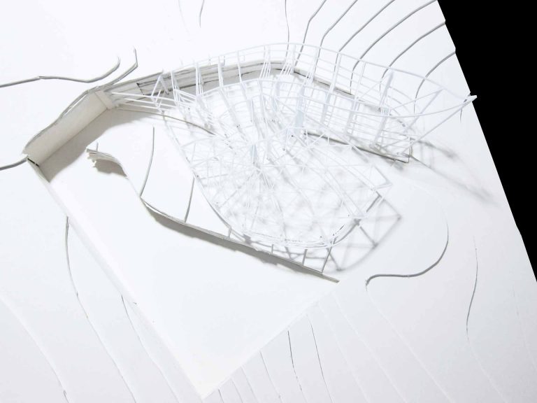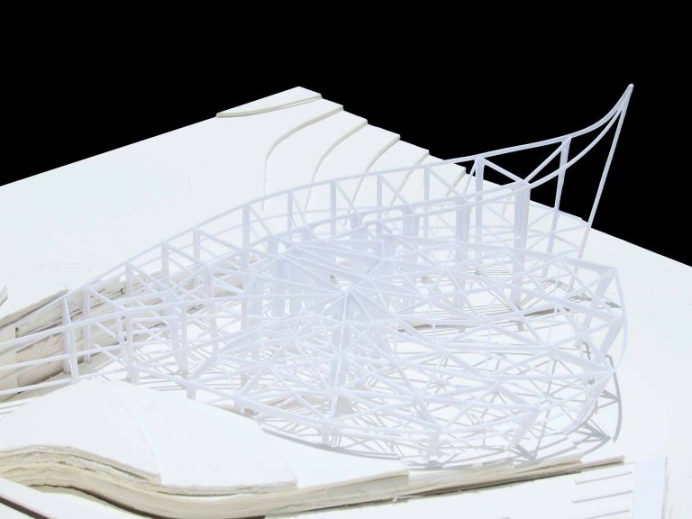 The form of the draft plan is reminiscent of a white dove resting before flying. The peace that passes the silhouette is implicit from the beginning not only because of the floor plan that remembers of a dove but also because the distribution of spaces and the relationship between them, always with curved walls and a topography that embraces both the building and the persons frequenting it.