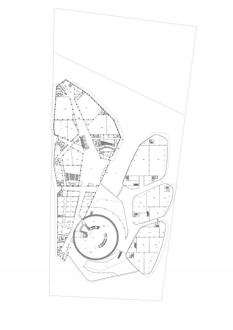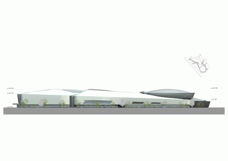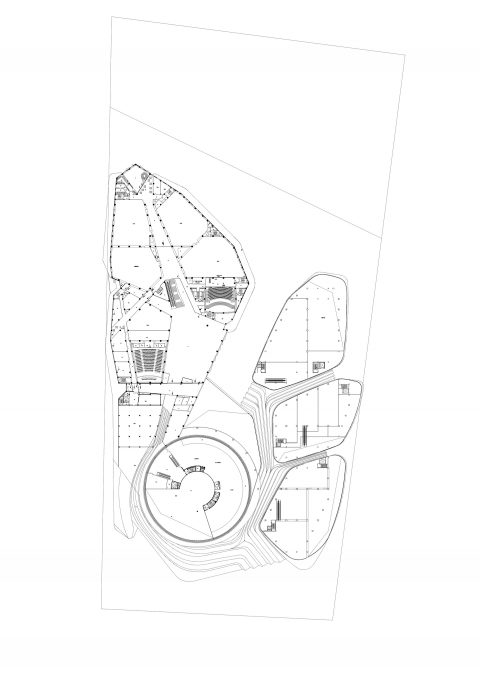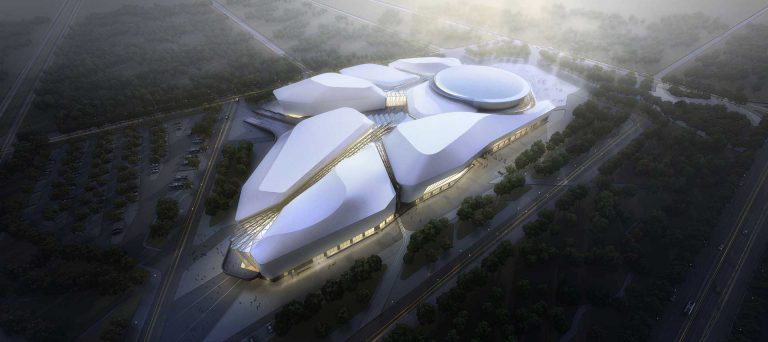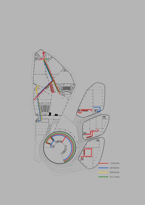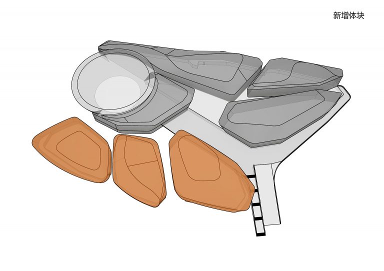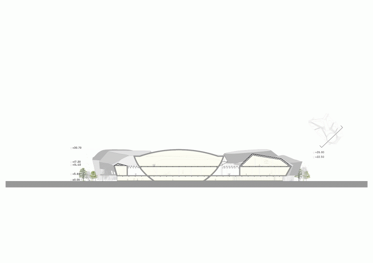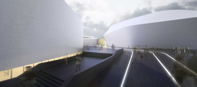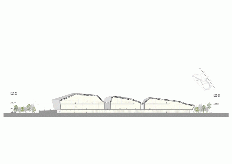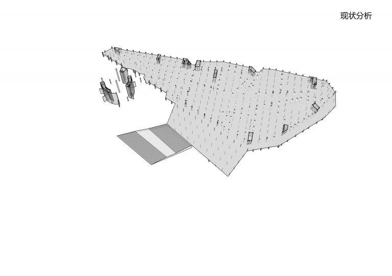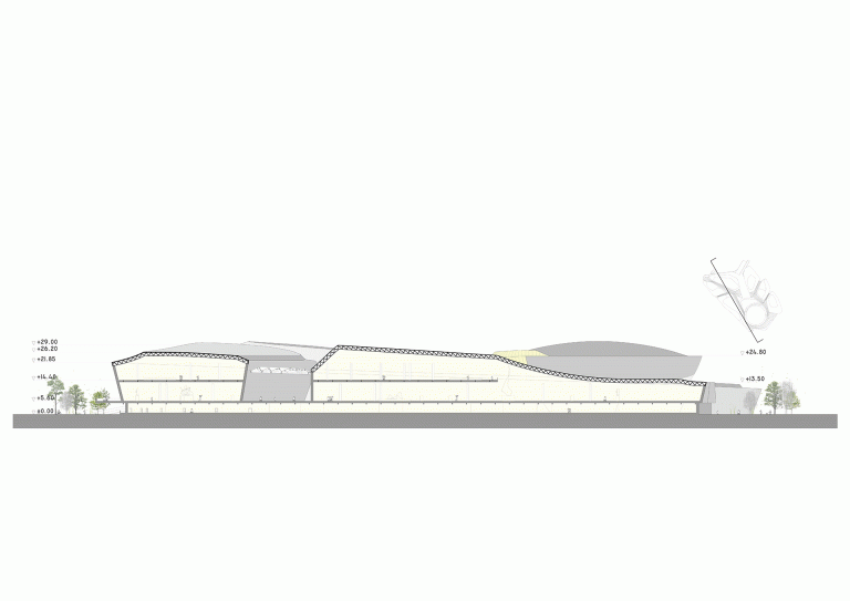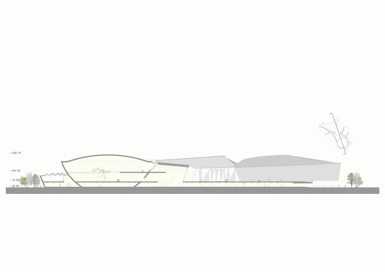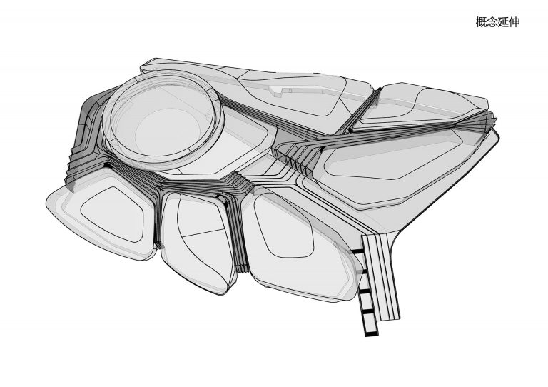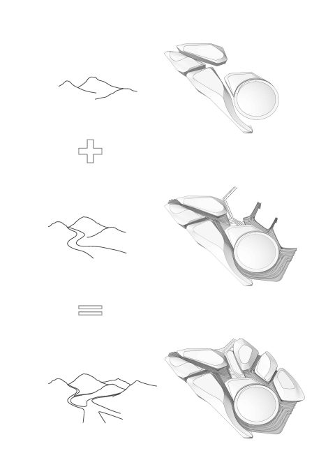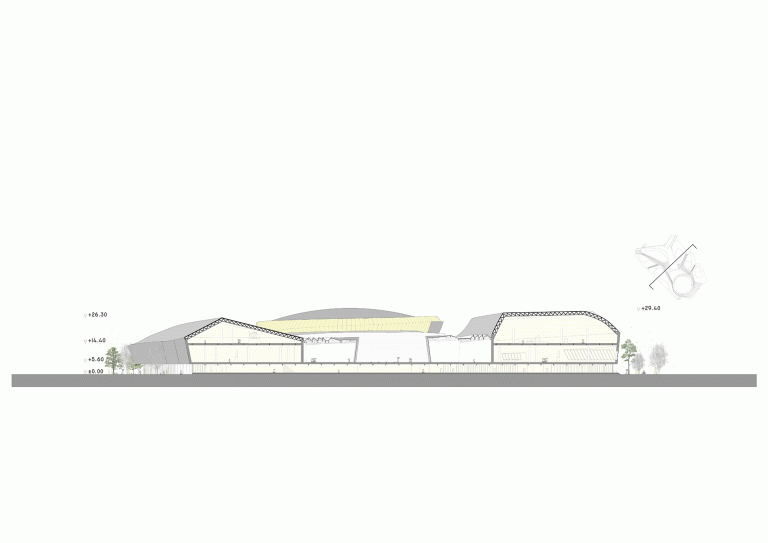 The design hosts six different themes of exhibition halls as the main body of the “white mountains”. Using the soft ridges of the white mountains for the roofs of the mains exhibition halls, the roof of the public space circulation corridor becomes the “black water”. Like the river, these public corridors connect all the exhibitions halls, in a strong and continuous way like waves of the river.