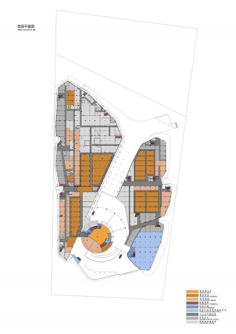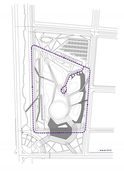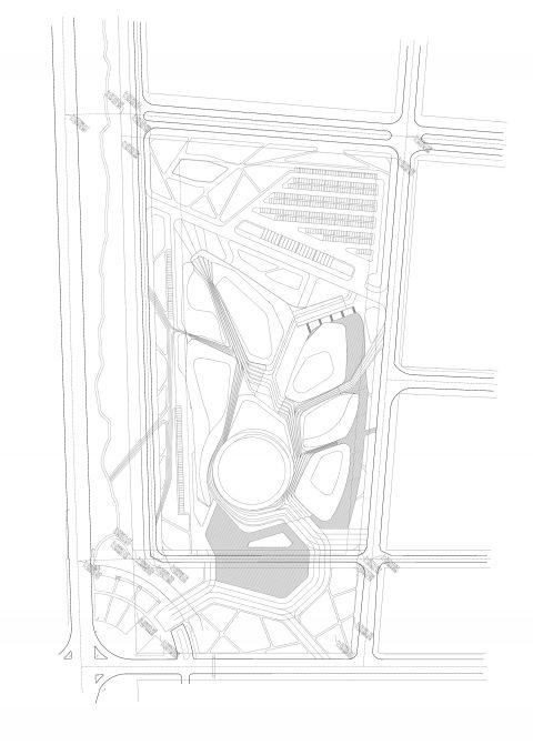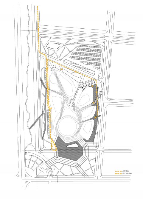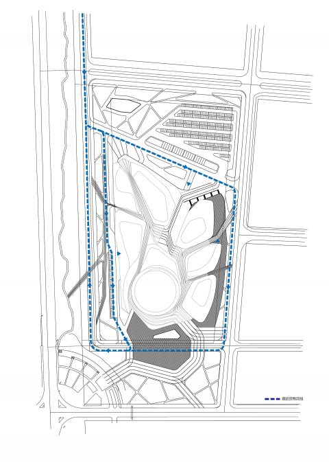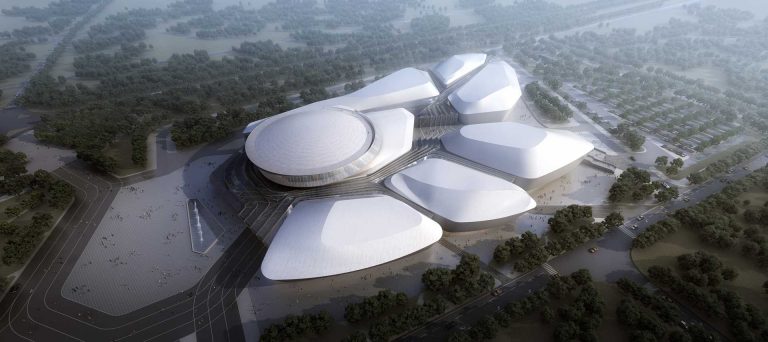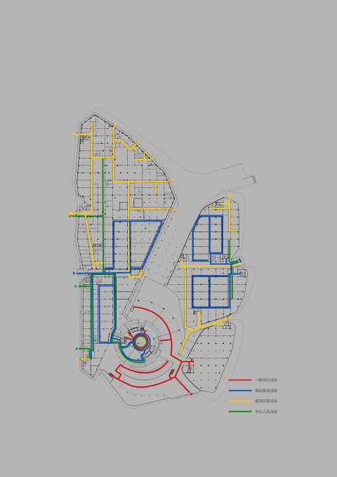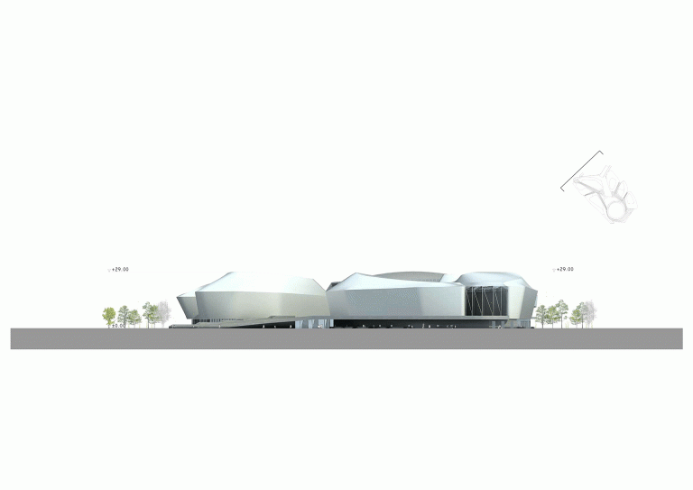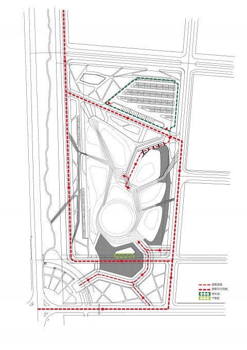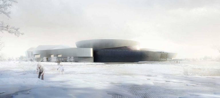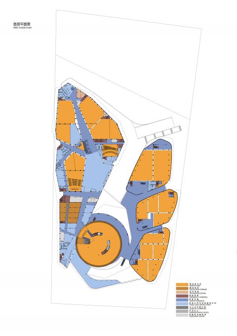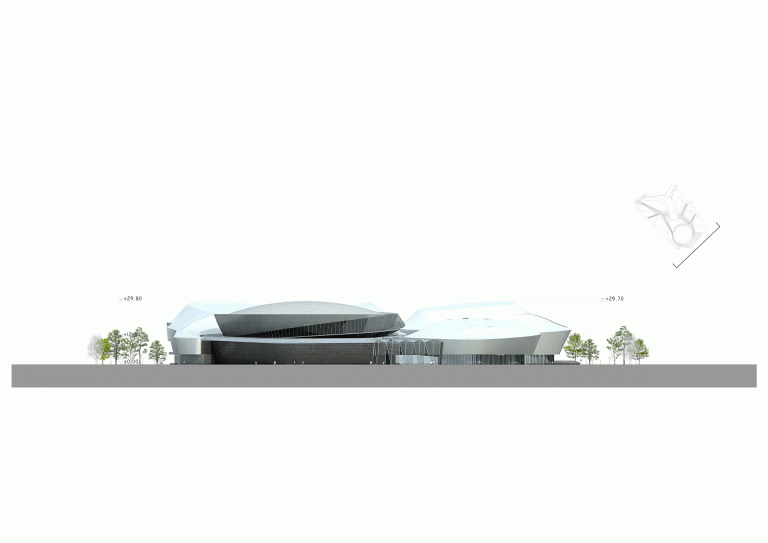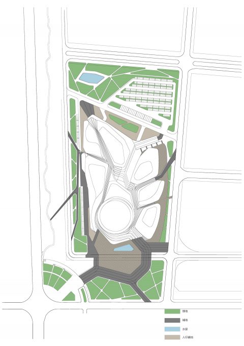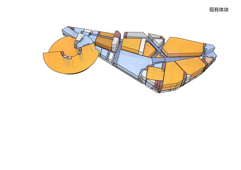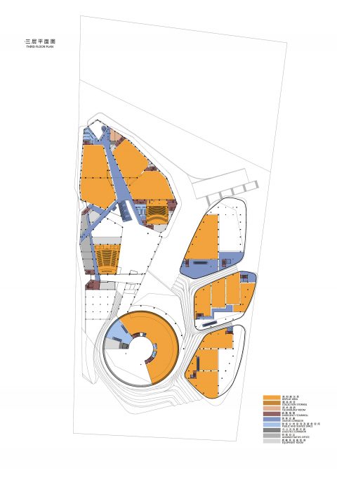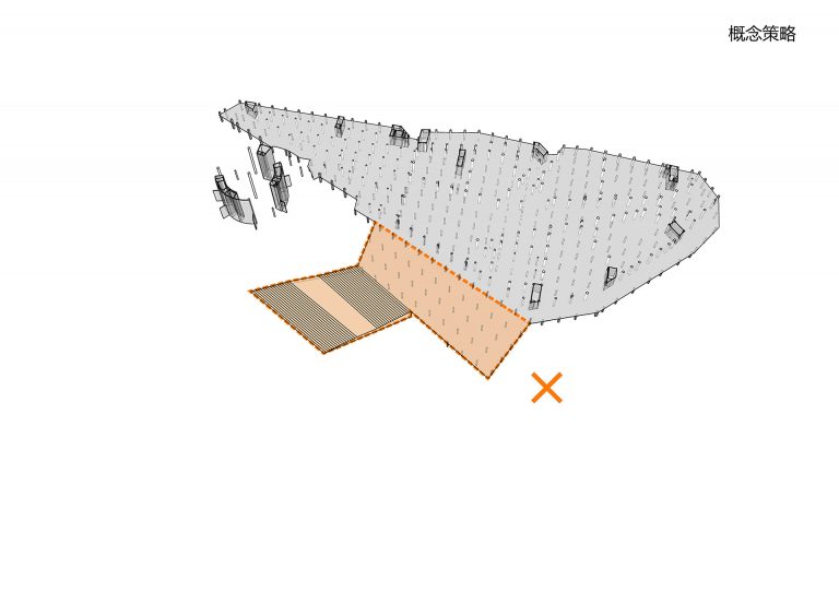 The design hosts six different themes of exhibition halls as the main body of the “white mountains”. Using the soft ridges of the white mountains for the roofs of the mains exhibition halls, the roof of the public space circulation corridor becomes the “black water”. Like the river, these public corridors connect all the exhibitions halls, in a strong and continuous way like waves of the river.