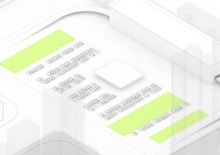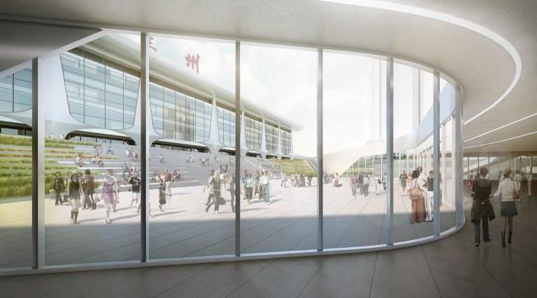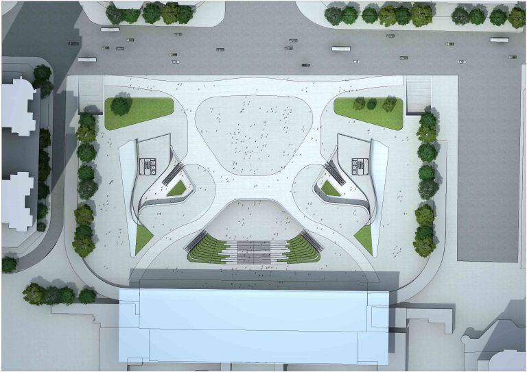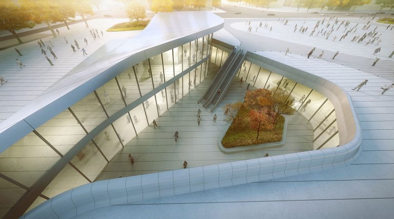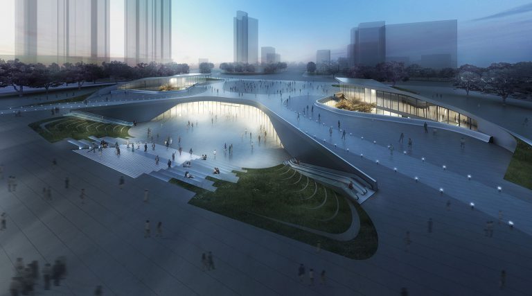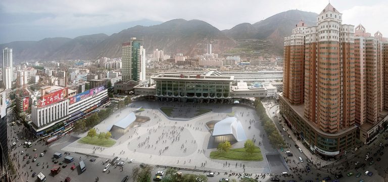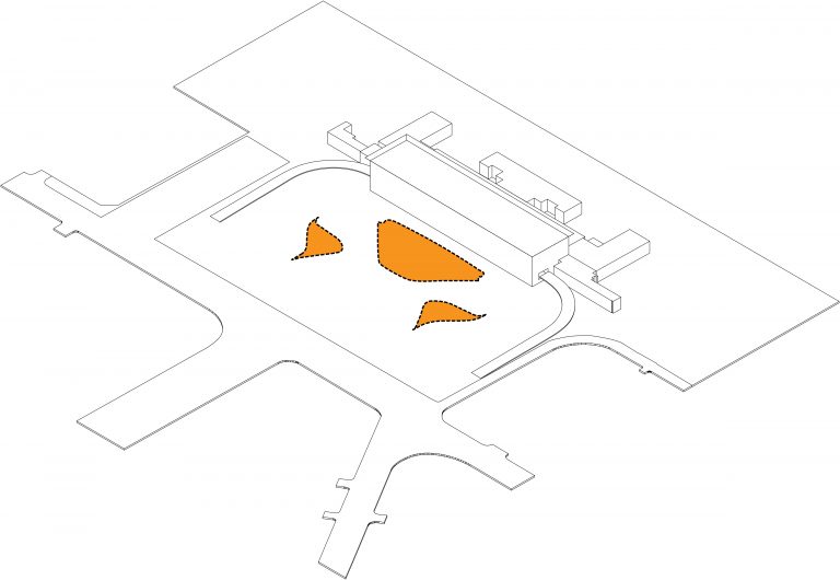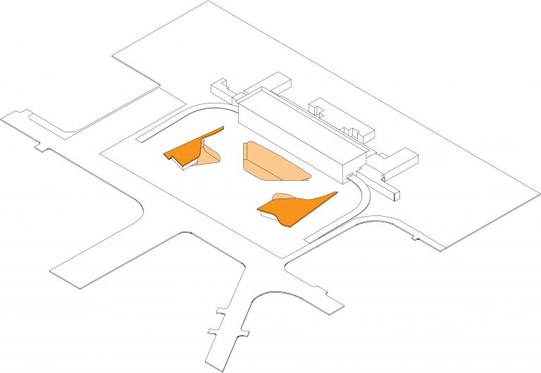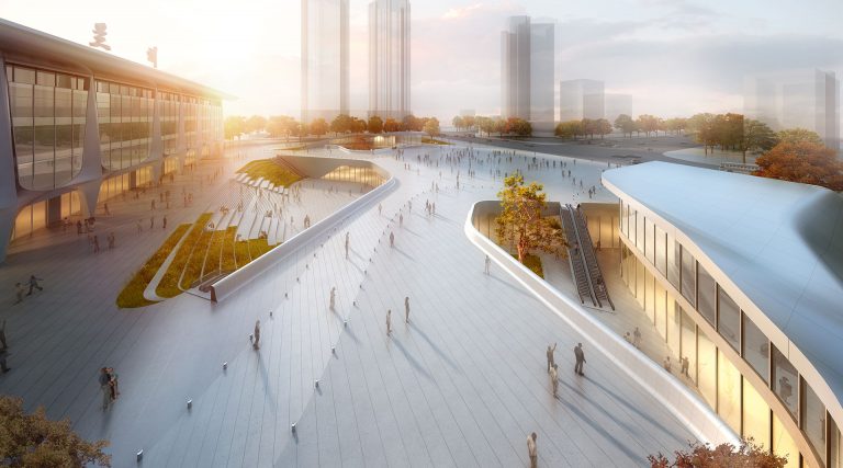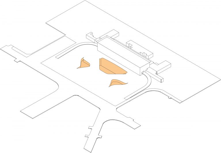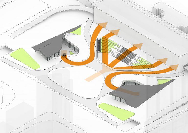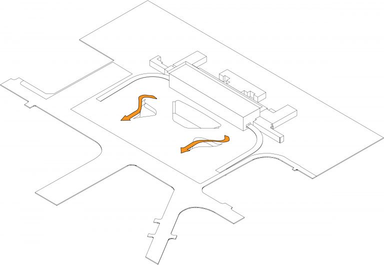Creating a sunken square for the station is a good way to separate the flow of people. This allows the ground level to act as a plaza where people can take a break to rest. The subway transfer station and taxi stand are located underground to alleviate the traffic congestion on the ground level. A glass box appears out of the ground on either side of the square. The space is divided by a gentle curve that responds to the original train station and the sunken plaza provides a soft translucent space that allows for more convenience for the citizens.