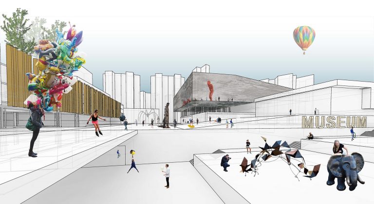 The site, surrounded by residential buildings north and east, with a subway station and a highway on the west and a park located on the south, is a perfect place for a cultural project like this.
