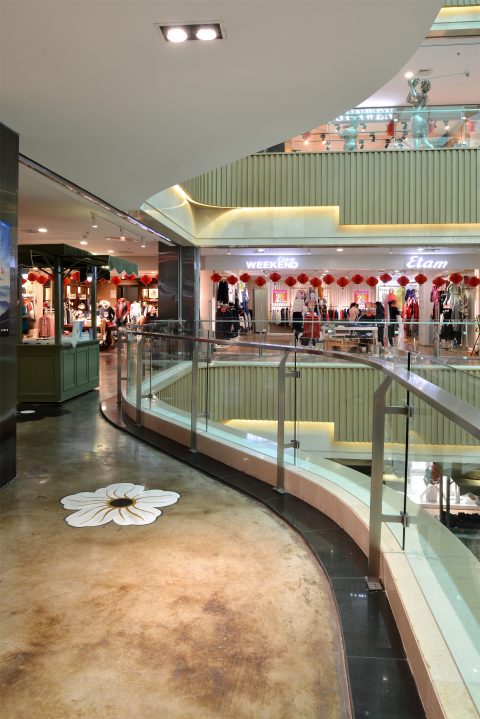 The glazed facade of the ground floor translates into a neutral theme in the interior design where high-end jewelry, cosmetics and leather items make it suitable for a winter theme – neutral bright monochromes and minimalist design – that enhance the display and bring the focus to detail.