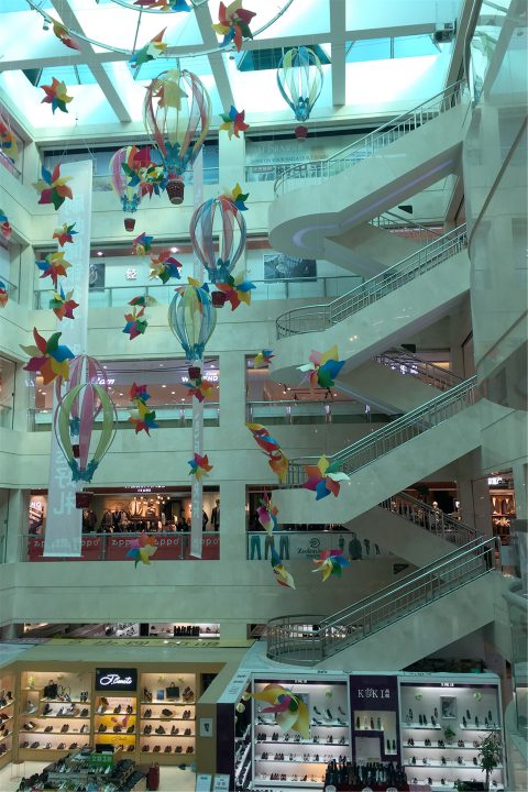 The above levels continue the seasonal theme by pairing womenswear with warm autumn colors and design elements reminiscent of fallen leafs, young fashion with spring pastels and summer brights for the home design, outdoor apparel and menswear level.